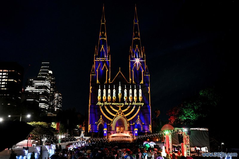 12月19日,澳大利亚悉尼圣玛丽教堂外墙被灯光点亮,吊问邦迪滩枪击事件遭难者。